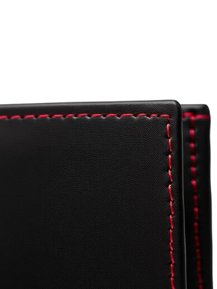 • Color: Black leather body with striking red-thread stitching along the outer border for contrast and style